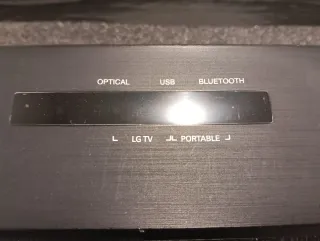 Barra de sonido LG en acabado negro. - Conexiones: Óptica, USB, Bluetooth. - Indicadores: LG TV, Portátil.