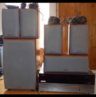Sistema de cine en casa JVC RX-554R, dolby surround Pro Logic, con dos altavoces JVC, dos Sony y dos Panasonic. Se ha utilizado de la siguiente manera. - Receptor Audio JVC. - Dos altavoces frontales Panasonic. - Dos altavoces traseros JVC. - Dos altavoces centrales Sony. Dispone de entradas de Phono, CD TAPE, VIDEO, VCR. La rueda del volumen falla un poco pero dispone de un mando universal para subir y bajar.