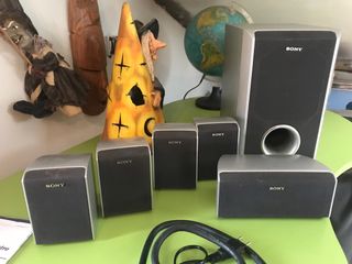 Sistema de cine en casa Sony en buen estado. Incluye un receptor AV y 5 altavoces. Perfecto para disfrutar de una experiencia de sonido envolvente en casa. - Receptor AV Sony con múltiples entradas y salidas. - 5 altavoces a juego, en color gris plata. - Diseño elegante y compacto. Adaptador conexión Bluetooth