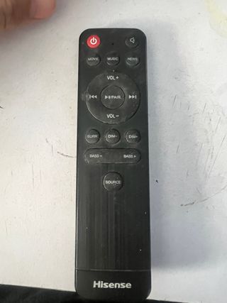 Mando a distancia para barra de sonido Hisense. - Botón de encendido/apagado. - Control de volumen. - Botones de modo: Movie, Music, News. - Botón Source.