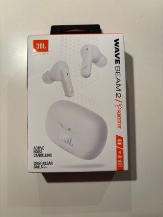 Auriculares inalámbricos JBL Wave Beam 2 en color blanco. - Diseño ergonómico para un ajuste perfecto. - Cancelación activa de ruido. - Llamadas nítidas y claras. - Hasta 40 horas de autonomía total.