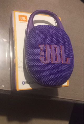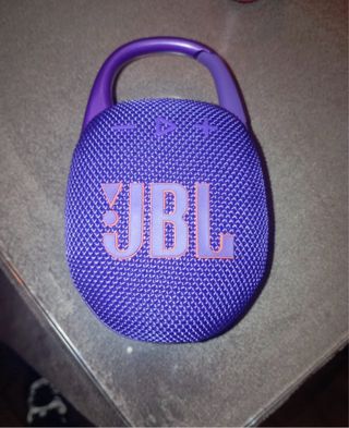 Altavoz portátil JBL en color morado. Diseñado para ser enganchado fácilmente a mochilas o ropa. - Diseño compacto y resistente. - Mosquetón integrado. - Conectividad Bluetooth.