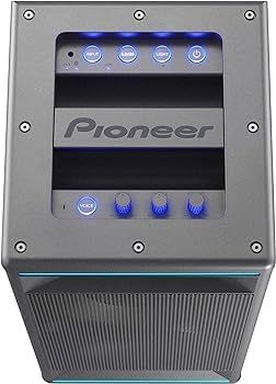 Altavoz portátil con un diseño moderno y llamativo. - Panel frontal con rejilla perforada. - Luces LED integradas que cambian de color. - Botones de control en la parte superior.
