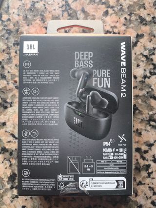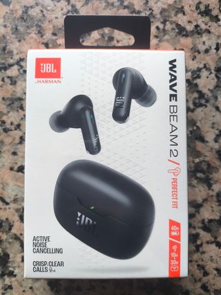 Sin estrenar. Auriculares JBL Wave Beam 2, inalámbricos y de color negro. Están en perfecto estado. - Cancelación activa de ruido. - Llamadas nítidas y claras. - Hasta 40 horas de batería.