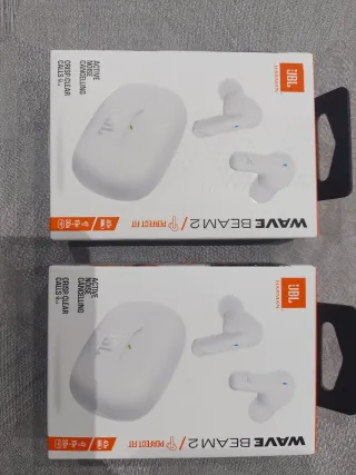 Auriculares inalámbricos JBL Wave Beam 2 en color blanco. Ofrecen cancelación activa de ruido y llamadas nítidas. - Cancelación activa de ruido. - Llamadas nítidas y claras. - Ajuste perfecto. - Hasta 40 horas de autonomía total. Precio 30 euros cada uno