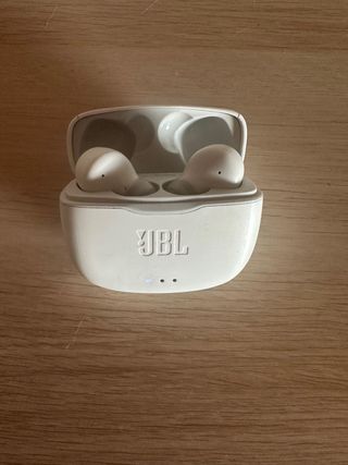 Auriculares inalámbricos JBL, en color blanco. Se encuentran en buen estado. - Son dos auriculares inalámbricos. - Vienen con su estuche de carga.