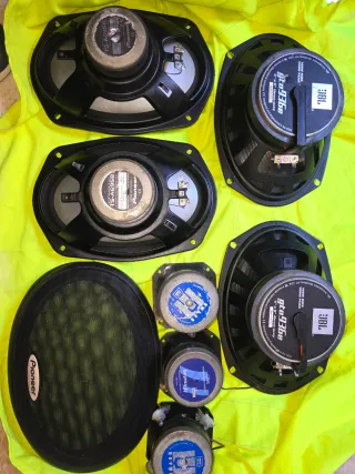 Conjunto de altavoces ovalados de 6x9 pulgadas. Se vende 2 parejas de altavoces pioneer y jbl en buen estado los JBL 300W Y LOS PIONEER 200W se regala 3 tweeter cp16 creo que solo se tiene que cambiar las membranas