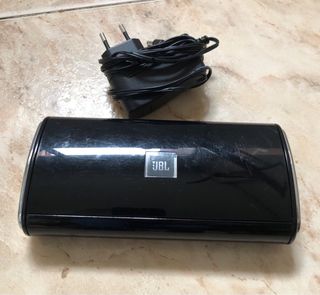 Altavoz portátil de color negro con el logo de JBL. - Diseño cilíndrico. - Incluye cable de carga USB y cable auxiliar.