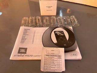Altavoz JBL OnBeat Venue con conexión Bluetooth. Diseño elegante en color blanco y plateado. - Conectividad Bluetooth. - Base para tablet. - conectividad mini audio - conectividad video Buen estado