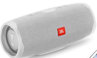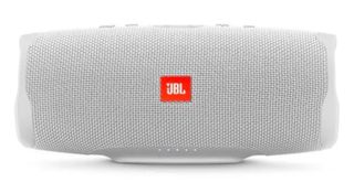 Altavoz portátil JBL Charge 4 en color blanco. Ofrece un sonido potente y diseño resistente. - Conexión Bluetooth. - Batería recargable de larga duración. - Resistente al agua.