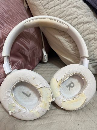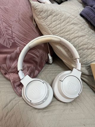 Auriculares JBL en color blanco, se escuchan bien. El acolchado de la diadema muestra signos de uso. - Diseño over-ear. - Logo de JBL en los laterales.