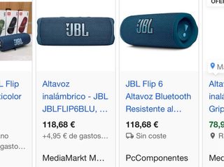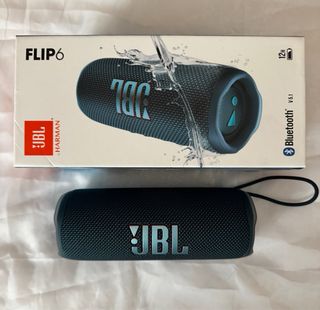 Dispo 2 unidades Precio cada unidad Altavoz portátil JBL Flip 6 en color azul con 30W de potencia (20W + 10W), conexión bluetooth 5.1 y USB-C, resistencia al polvo y el agua (IP67), batería de hasta 12h de autonomía. - Resistente al agua y al polvo. - Hasta 12 horas de reproducción. - Conexión Bluetooth.
