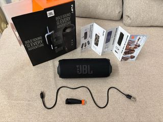 Altavoz portátil JBL Flip 7 en color negro. Ofrece un sonido potente y es ideal para aventuras. - Diseño compacto y resistente. - Incluye cable de carga USB y guía de inicio rápido.
