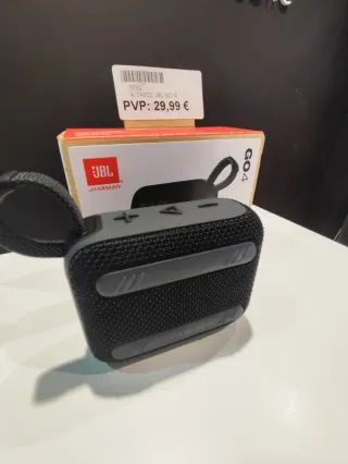 Altavoz portátil JBL GO Essential 2 en color negro. Ofrece hasta 5 horas de autonomía y es resistente al agua. Precio de venta recomendado 35€. Completamente nuevo a estrenar en su embalaje original precintado sin abrir. No hago envíos. Solo entrega en mano con pago en metálico en Torrejón de Ardoz. - Modelo: JBL GO Essential 2 - Conectividad: Bluetooth - Resistencia: IP67 al agua - Autonomía: hasta 5 horas
