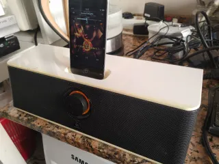Altavoces Logitech Pure-Fi Dream con dock. Dimensiones aproximadas: 35x15x12 cm (largo, alto y fondo). Conservado en muy buen estado, funciona perfectamente y tiene muy buen sonido. Cuenta con funciones tales como una pantalla LCD para visualizar información, función despertador, sintonizador de radio AM/FM, base de carga y mando a distancia retro-iluminado. Entrega sólo en persona.