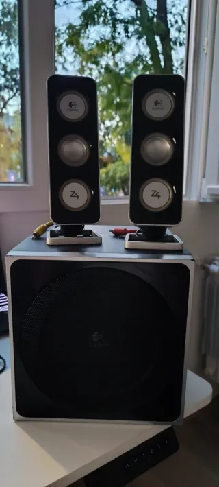 Conjunto de altavoces Logitech con acabado en negro y detalles plateados. - Diseño moderno y elegante. - Incluye subwoofer y dos altavoces satélite. - A sido usado muy poco y esta como nuevo - Todo suena perfecto sin ninguna cadencia