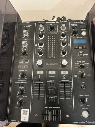 Mezclador DJ Pioneer DJ DMJ-450 en color negro. - Controles de canal y master. - Sección de efectos Sound Color FX. - Crossfader Magvel. - Conexión para auriculares.