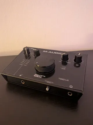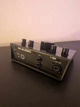 Interfaz de audio M-Audio AIR 192|4 en acabado negro. - Diseño compacto y elegante. - Controles intuitivos para ajustar niveles. - Conexión USB para alimentación y datos. - Entrada para micrófono o instrumento. - Salida de auriculares.