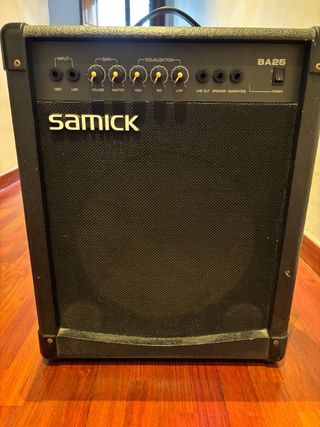 Amplificador de guitarra Samick BA25. - Controles de ganancia y ecualización. - Conexiones para auriculares y línea.