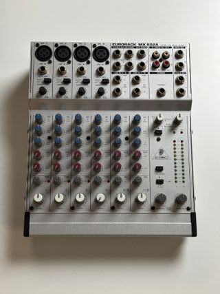 Mesa de mezclas Behringer EURORACK MX802A. - 8 canales. (4 entradas en línea, y 2 estereo(que son 2 canales cada)) - No tiene marcas de uso. - Se ha utilizado en estudio para rutas internas. - Tiene alimentación phanton. - Diseño compacto y ligero. - Ideal para aplicaciones de audio. - Conexiones versátiles.
