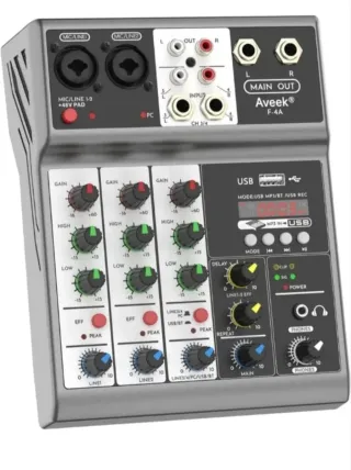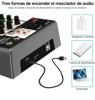 Mesa de mezcla compacta y versátil, ideal para grabaciones de audio. - Compatible con micrófonos de condensador. - Diseño de bajo ruido. - Puerto de entrada XLR con alimentación phantom de 48V.