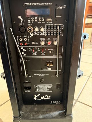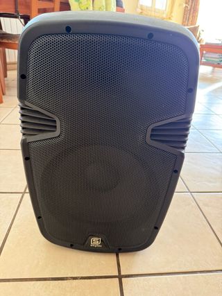 Altavoz amplificador PA912 de la marca Skytec en color negro. Diseñado para ofrecer un sonido potente y claro. - Diseño moderno y robusto. - Rejilla protectora frontal. - Asas laterales para facilitar el transporte. Se ha roto la rueda para llevarlo con las asas, por el resto todo perfecto.