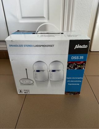 Set de altavoces estéreo inalámbricos Alecto DSS 35, aptos para interior y exterior. Incluye un transmisor y dos altavoces. Resistente a la lluvia y al exterior. En perfecto estado sin abrir - Control de volumen digital. - Iluminación LED ambiental. - Resistente a salpicaduras (IPX5). - Diseño moderno en color blanco.