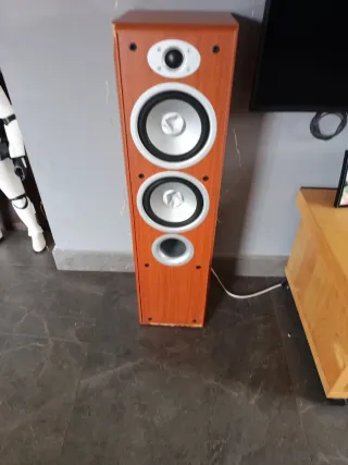 Se venden altavoces Jamo en color madera y plata, junto con un amplificador Denon. Tienen uso pero suenan perfectamente. También cambiaría por barra de sonido o altavoz auto amplificado para exterior - Altavoces de torre Jamo. - Amplificador Denon.