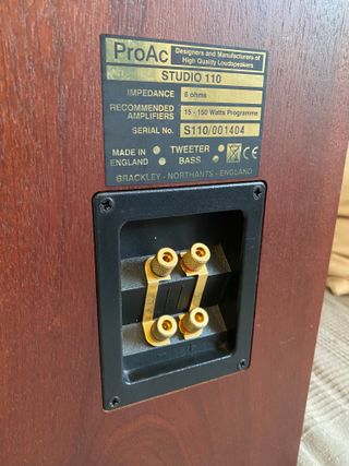 Altavoces de estantería ProAc Studio 110 en acabado marrón. - Diseño compacto y elegante. - Tweeter de cúpula. - Puerto bass reflex frontal. Las dos cajas están perfecto estado de sonido. Una de ellas tienen una marca exterior tal y como puede verse en la última foto. No me interesan cambios, gracias.