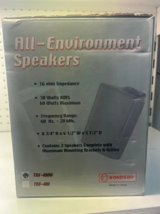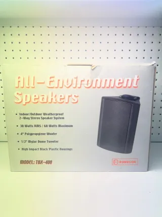 Juego de altavoces Rondson TBX-400, diseñados para interiores y exteriores. - Sistema de altavoces estéreo de 2 vías. - 30 vatios RMS / 60 vatios máximo. - Woofer de polipropileno de 4 pulgadas. - Tweeter de cúpula Mylar de 1/2 pulgada. - Carcasas de plástico negro de alto impacto.