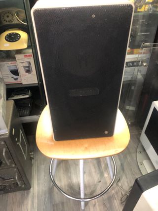 Altavoz de sobremesa con un diseño elegante y minimalista. Ideal para complementar tu iPod. - Funciona todo - IMPORTANTE: La base de audio y carga del iphod funciona únicamente calzando el iphod hacia delante (ver imágenes) - Incluye mando a distancia funcional - Incluye cable de potencia funcional, aunque con el apantallamiento exterior algo roto en un punto (ver imágenes) - Viene sin el ipod