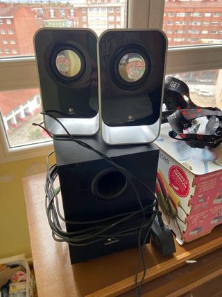 Conjunto de altavoces para ordenador, ratón y webcam. - Altavoces negros. - Webcam con soporte. - Cables incluidos. - Todo 15€