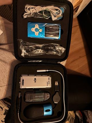 Estuche con MP3, ratón para ordenador con cable extensible, lampara lectura USB, slim Hub 4 puertos USB y auriculares de botón con cable. En un fantástico estuche organizador, sin usar.