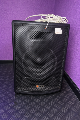 Altavoz Bafle BCT de color negro. Ideal para sonido. BCT — Professional Speaker System — Modelo EV01 (o abreviado: BCT EV01) - Rejilla frontal protectora. - Logo de la marca BCT en la parte inferior.