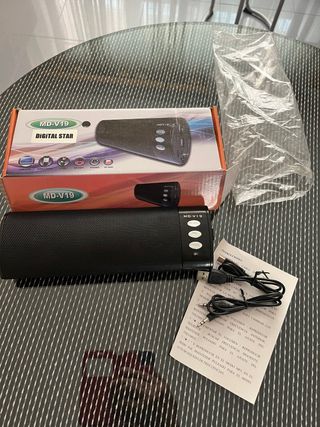 Vendo altavoz portátil MD-V19 de la marca Digital Star. Es de color negro y tiene un diseño cilíndrico. - Reproduce MP3 y MP4. - Se conecta a ordenador, móvil y otros dispositivos. - Incluye ranuras para tarjetas SD y USB. - Dispone de altavoz integrado. SOLO ENVIO