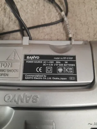Radio portátil Sanyo RP-6165F con recepción AM/FM. Funciona con corriente alterna (AC) o pilas (DC). - Diseño compacto y ligero. - Antena telescópica. - Selector de banda AM/FM. - Medidas 22×14cm. Fabricado en Japón.