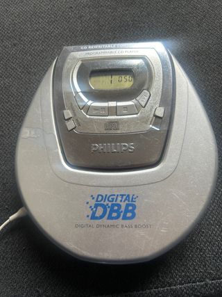 Reproductor de CD portátil Philips con tecnología Digital Dynamic Bass Boost. - Diseño plateado y gris. - Pantalla LCD. - Botones de control de reproducción.