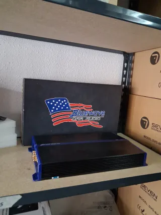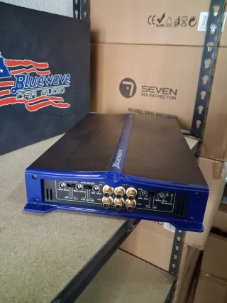 Amplificador de audio para coche Bluewave. - Diseño elegante en negro con detalles azules. - Logotipo de la marca en la parte superior.
