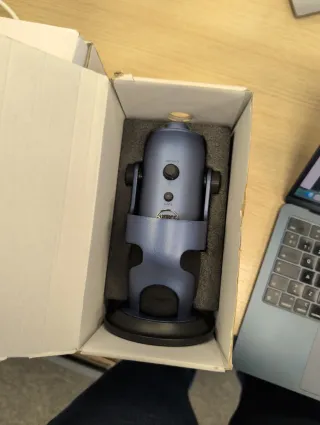 Micrófono Blue Yeti en color azul metálico con detalles en negro. Incluye un filtro antipop. - Diseño elegante y moderno. - Base estable para colocar sobre escritorio. - Viene sin cables.