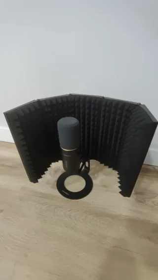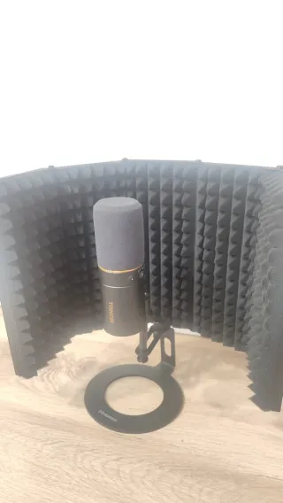 Kit de podcast TONOR que incluye micrófono y pantalla acústica. - Micrófono de color negro y detalles dorados. - Pantalla acústica negra con espuma. - Soporte de micrófono circular.