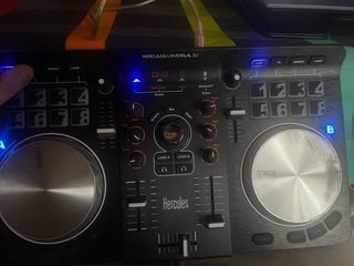 Mesa de mezclas DJ Hercules Universal en color negro y plateado. Ideal para DJs. - Dos jog wheels. - Controles de EQ (Treble, Mid, Bass). - Pads de efectos y samples. Lo he probado conectandolo al pc y funciona