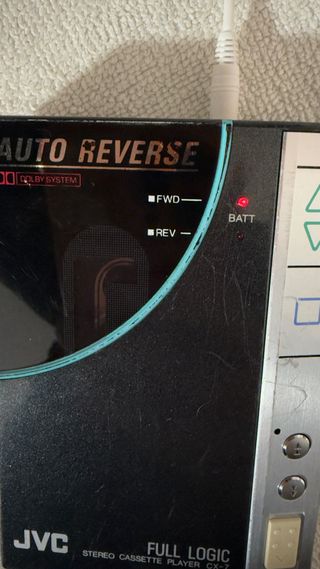 Reproductor de cassette estéreo JVC CX-7 con función Auto Reverse. - Diseño Full Logic. - Indicador de batería (BATT). - Botones de avance (FWD) y retroceso (REV). - Función de bloqueo (LOCK). Walkman profesional funciona perfectamente