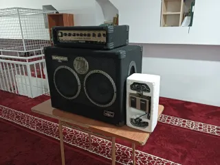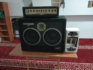 Amplificador de bajo Behringer. - Modelo Ultrabass BX4500H. - Incluye cabezal y pantalla. - Pantalla con dos altavoces de 15 pulgadas. - Incluye pedalera. - Color negro y beige.