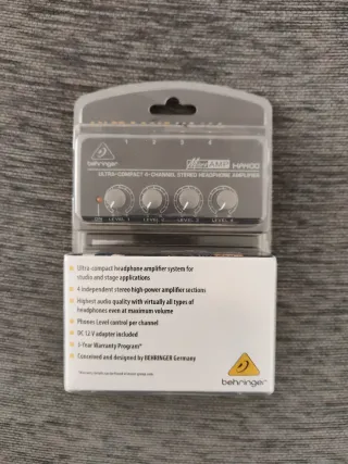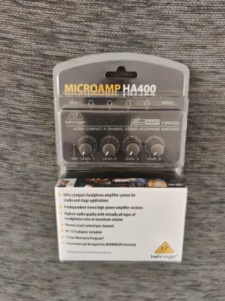 Amplificador de auriculares Behringer Micro AMP HA400. - Sistema de amplificador de auriculares ultracompacto para estudio y aplicaciones de escenario. - 4 secciones de amplificador estéreo independientes de alta potencia. - Máxima calidad de audio con prácticamente todos los tipos de auriculares, incluso a volumen máximo. - Control de nivel de auriculares por canal. - Incluye adaptador de corriente de 12 V CC. - Programa de garantía de 3 años. - Concebido y diseñado por BEHRINGER Alemania.