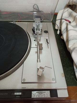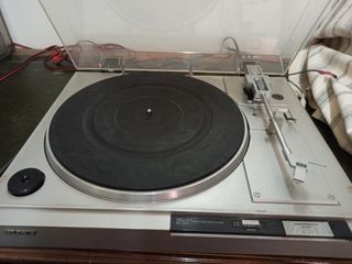 Se vende tocadiscos Sony de color negro. Está en buenas condiciones, con algunas señales de uso visibles. - Incluye tapa protectora. - Plato giratorio en buen estado. - Brazo de lectura incluido.