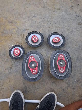 Altavoces Sony Xplod en color negro. Se venden 5 unidades. El precio es por las cinco no las vendo suelta las 5 por 60€ - Diseño ovalado y circular. - Detalles en color rojo.