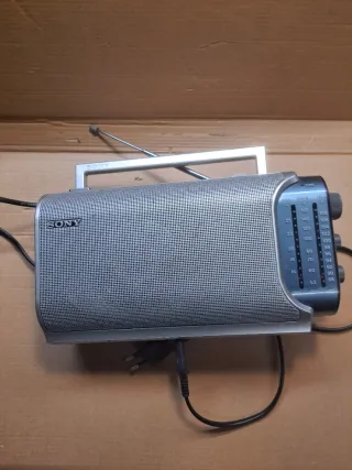 Radio portátil de la marca Sony en color plata. Ideal para llevar a cualquier parte modelo icf 704 l Funciona bien - Diseño compacto y ligero. - Antena extensible para mejor recepción. - Asa de transporte integrada.