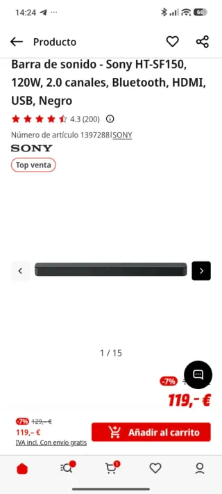 Barra de sonido Sony HT-SF150 en color negro. Ofrece 120W de potencia y 2.0 canales. - Conectividad Bluetooth, HDMI y USB. - Diseño elegante y compacto. Solo tiene un pequeño toque que se aprecia en una de las fotos. En la realidad se ve menos que en la foto 50