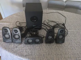 Se vende sistema de altavoces Logitech Z906 con sonido envolvente 5.1 y 1000 w de pico, muchas entradas y multidispositivo para TV, ordenadores, PC, portátiles, play station, Xbox, Móvil Usados hasta hace unos meses, cambié el sistema por uno inalámbrico, sin cables, he perdido calidad y potencia, pero no veo cables. Está en buen estado, el subwoofer, centralita y el mando están en perfecto estado, uno de los altavoces satélite tiene marcas visibles en un lateral, por rozar en la pared y otro tiene marcas mas leves, es solo estético, funcionan perfectamente, el resto perfecto. No rebajo. Envío a usuarios con perfil positivo.