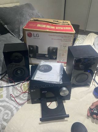 Sistema de sonido LG XBoom CM2460 con altavoces. - Ofrece un sonido potente con una salida RMS total de 100 W (50W por canal) - Audio Micro Hi-Fi - Incluye Bluetooth para transmitir música de forma inalámbrica desde dispositivos móviles y un puerto USB para reproducción directa -Compatible con formatos de audio FLAC sin pérdida de calidad y cuenta con modos de ecualización preestablecidos (POP, Clásica, Rock, Jazz, etc.). -Sintonizador de radio FM con RDS y capacidad de sincronización inalámbrica con televisores LG compatibles (TV Sound Sync). -CUALQUIER DUDA NO DUDES EN ESCRIBIRME